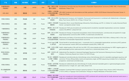在消化系统肿瘤领域,AG真人产品相关研究共入选2项口头报告、11项壁报和1项电子壁报,共14项研究。除卡瑞利珠单抗和阿帕替尼外,还有4篇阿得贝利单抗治疗消化系统肿瘤研究入选。HRS-4642、瑞拉芙普-α注射液(SHR-1701)等在研创新产品也有相应研究亮相。另有1项伊立替康脂质体(II)用于胰腺癌治疗的研究入选壁报。